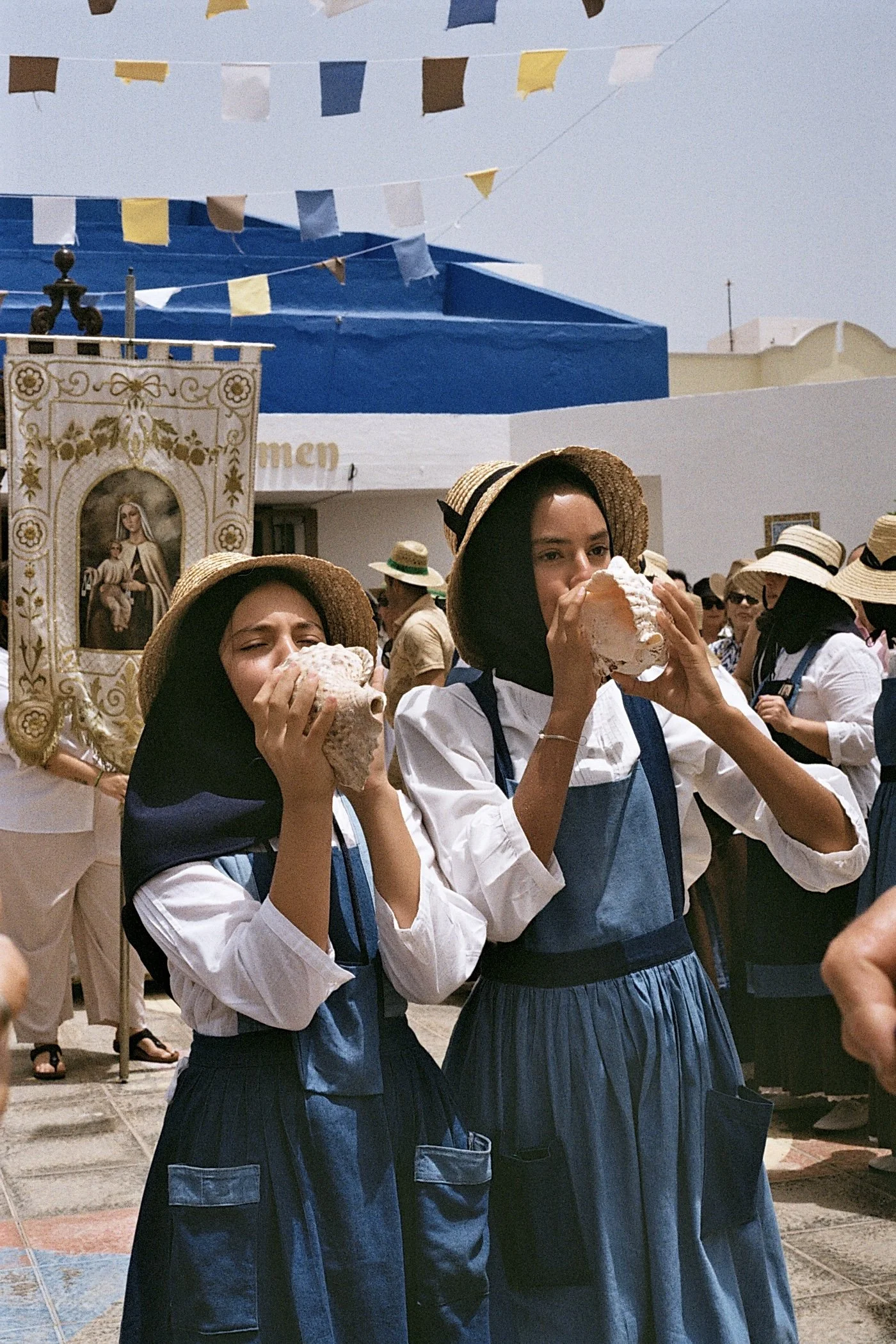 Captured during La Fiesta del Santa María del Carmen in Fuerteventura, this image shows two young girls blowing conch shells as part of a procession welcoming the Virgin Mary. Witnessing this moment revealed parallels between spiritual practices in the East and West. The conch shell, used to purify energy before a deity is honoured, echoed rituals I have encountered in Hindu traditions. With chanting, music and the statue later bathed in the sea, the atmosphere felt closer to nature worship than conventional Catholic ceremony. Experiences like this have shaped the thinking behind this R+D project.